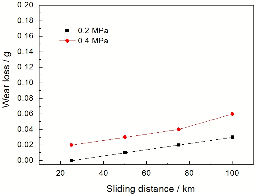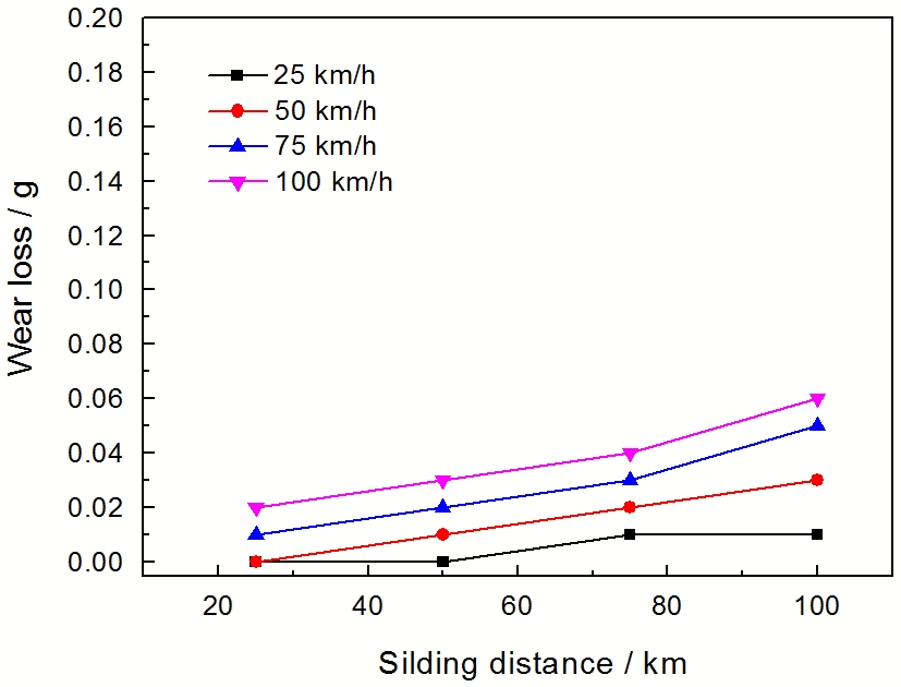1. 速度对铜钛硅碳石墨合金材料磨损量的影响呈现较好的规律性, 随着速度的增加磨损量呈线性增长。低载时, 随着滑行距离的增加磨损量呈线性增长。高载时, 随着滑行距离的增加磨损量先线性增长后呈上扬的趋势。