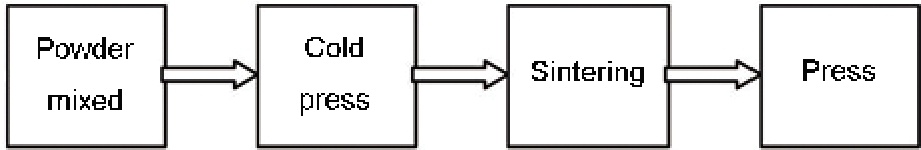 表1列出了实验所用各种粉末的粒度和含量(以质量分数计)。制备工艺流程如图1所示。采用机械干混法混料12 h, 在侧压式粉末制品液压机上以300 MPa的压力进行压制, 在氢气保护气氛下进行烧结, 烧结温度为920℃, 烧结时间为3 h。烧结后在氢气保护气氛下炉冷至室温, 再以300 MPa的压力进行复压。