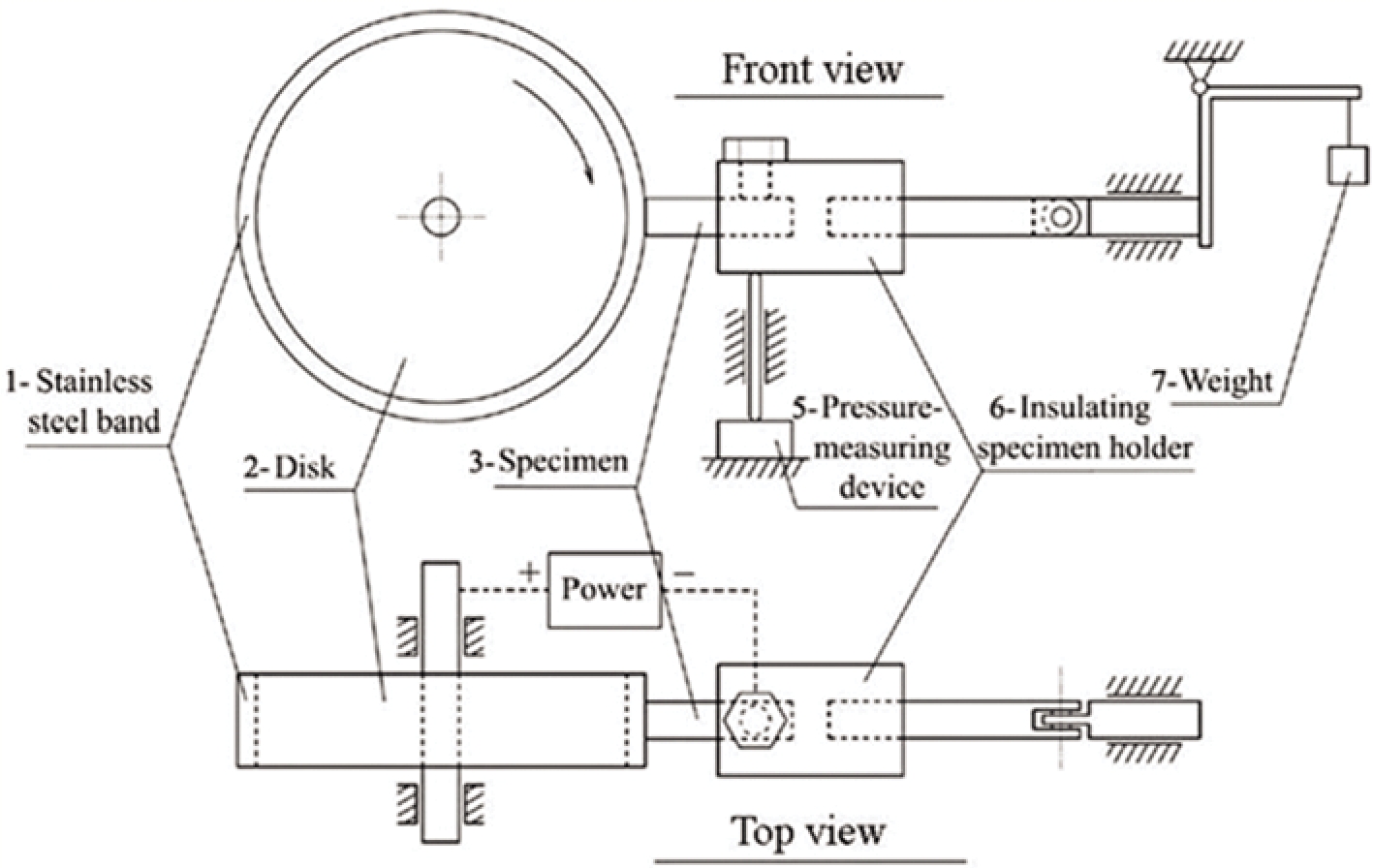 磨损实验是在如图2所示的自制的摩擦磨损实验机上进行的。此装置有一个直径为405 mm的铸件转盘2, 沿其外缘缠绕并固定装有铜带材, 截面为50 mm×5 mm, 采用精密加工技术将接缝处理完好。轮盘外缘线速度0-100 km/h可调, 运动平稳, 试样尺寸为10 mm×10 mm×35 mm的销试样, 摩擦面为10 mm×10 mm, 接触压力分别为20 N和40 N, 相对滑动距离为25, 50, 75和100 km。进行磨损实验前, 试样均在800号砂纸上打磨, 采用精度为1 mg的电子天平称量试样的磨损质量损失, 所有实验均在实验室环境中完成。