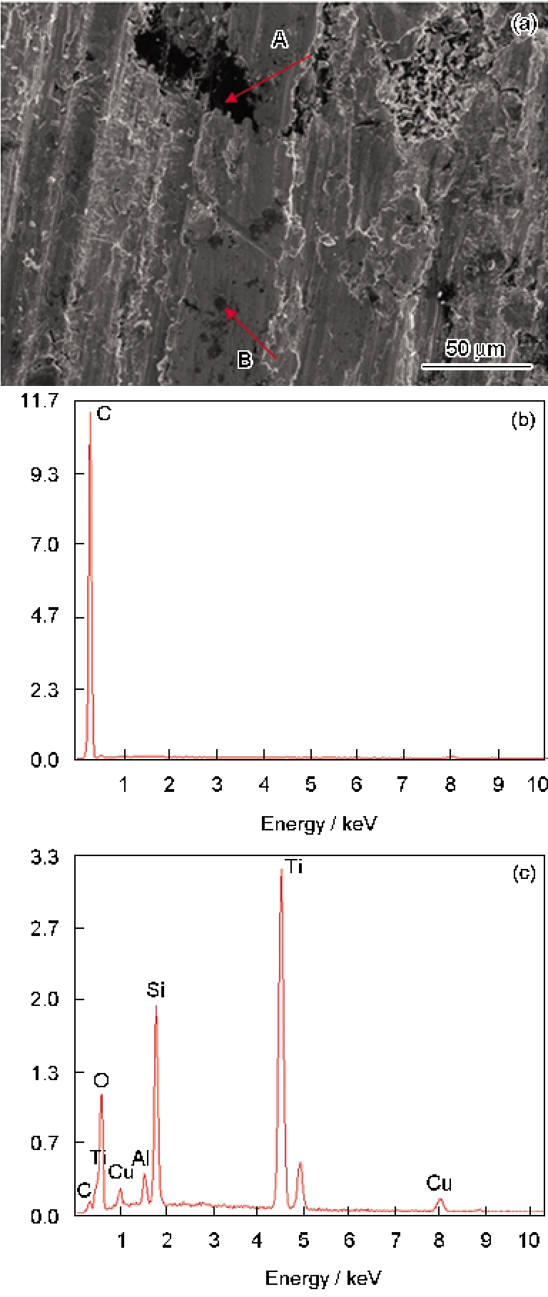 如图5所示为合金在载荷为20 N、滑行速度为50 km/h的条件下与摩擦副相对滑行100 km后的试样SEM表面形貌和能谱分析。由图5a可见, 磨痕方向基本一致, 合金表面有较多的坑点和一些较大的片状层, 部分区域表面有犁沟, 磨损表面局部存在氧化膜, 摩擦表面较均匀的分布着许多颗粒物质和大块的深黑色残留物。对图5中的A点和B点进行EDS能谱分析, 结果如图5b和5c所示。其中A点主要含有碳, 是材料中含有的石墨经过摩擦后破碎形成的, 在摩擦磨损过程中起到了自润滑的作用。对B点的分析表明, 表面含有Ti, C, Si, O, Cu等元素, 说明表面有TiC硬质结晶相生成[16]。合金表面有氧原子, 说明在摩擦磨损过程中可能有氧化物的生成。