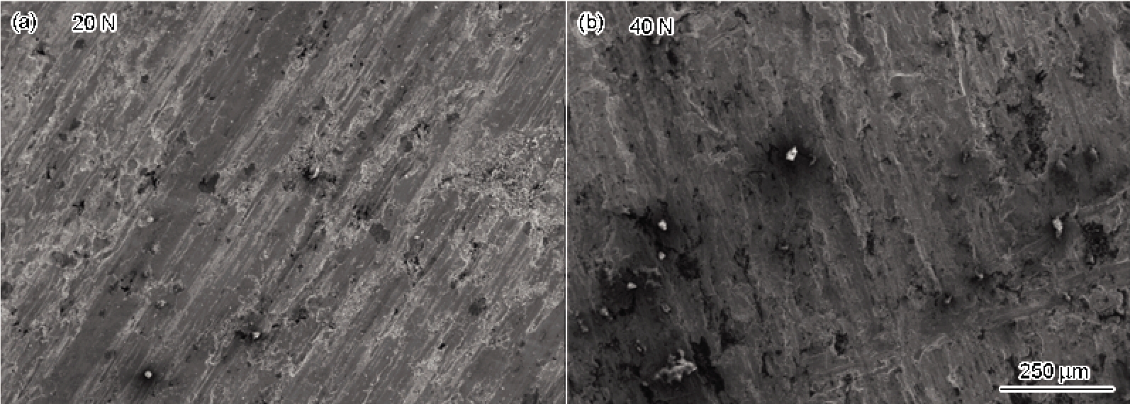 图6给出了不同载荷作用下的合金的摩擦表面形貌。由图6a可见, 在低载荷情况下磨损表面现对较光滑, 磨痕方向一致, 摩擦产生的硬质粒子较少。载荷越大产生的正压力越大, 随之产生较大的剪切应力。较大的剪切应力更易产生粘着磨损, 从而使材料发生转移和剥落, 进而产生更多硬质粒子, 从图6b可见磨损表面含有更多的硬质粒子, 但是磨痕并不明显, 磨损表面也不光滑。另一方面, 摩擦产生的摩擦热导致试样表面温度升高, 材料摩擦表面软化, 降低表面的塑性[20-21]。且随着温度的升高磨损表面氧化程度会加剧[22], 因此磨损表面比较粗糙。