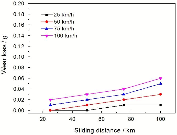 图3给出了接触压力为20 N条件下试样磨损量与滑行速度的关系。可以看出, 在整体上, 随着速度的增大材料的磨损量大幅度增加, 滑行50 km后速度对磨损量的影响几乎呈线性增长。在速度较小(V<50 km/h)时, 磨损量随着滑移距离的增加先增加然后趋于平稳。在速度较大(V≥50 km/h)时, 磨损量随着滑移距离的增加也呈平稳线性增长。其原因是, 速度的增加导致表面切向冲击力增大, 在较大冲击力的作用下材料中界面结合力较弱的粒子与基体剥落分离 [12]。