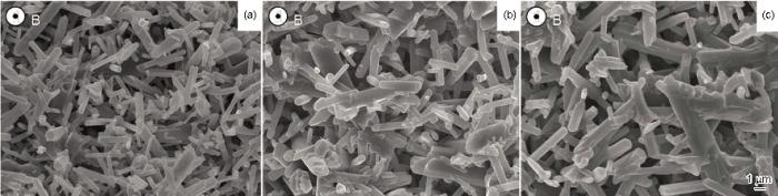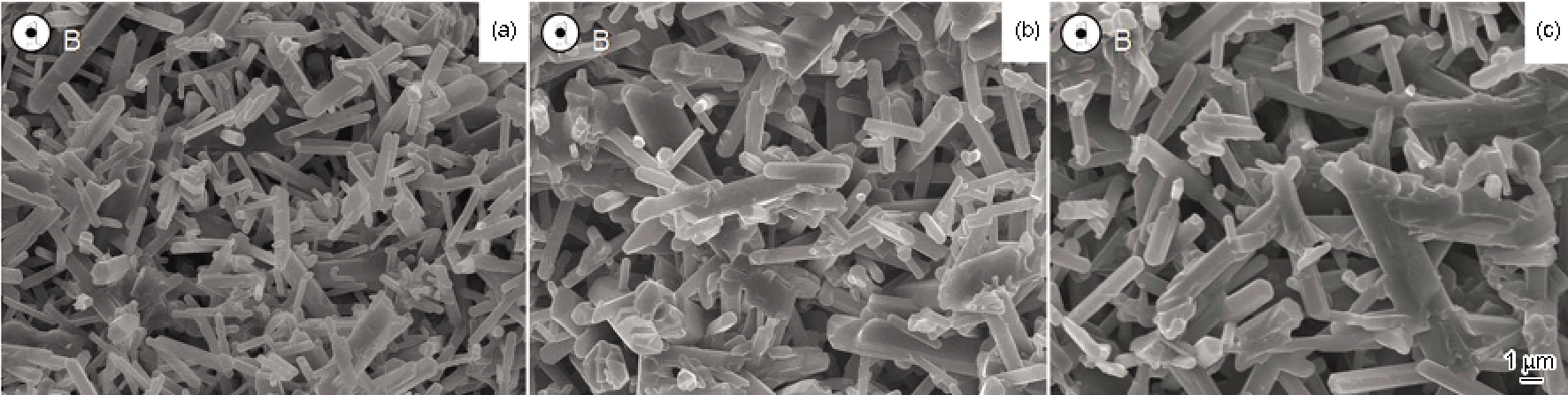 根据之前的研究结果[17], 使用初始原料β-Si3N4粉末, 在6T的纵向磁场中获得了织构度较高的氮化硅陶瓷, 特别是在素坯成型阶段就获得高织构化的氮化硅素坯, 说明β-Si3N4颗粒易于在6T的磁场条件下形成取向。在氮化硅陶瓷的研究中, 采用α-Si3N4粉末, 添加β-Si3N4籽晶可制备出高性能的氮化硅陶瓷。采用这种原料体系, 在烧结过程中会经历颗粒的重排, 溶解-淀析和晶粒长大过程。在溶解-淀析过程中会发生α→β相的转变, 同时伴随着晶粒的生长[18]。在α-Si3N4粉末中添加的9wt%β-Si3N4的籽晶颗粒, β-Si3N4作为晶核促进相的转变和晶粒的增长, β-Si3N4晶粒的取向一定程度上决定最终烧结体的取向。如果在素坯阶段通过添加籽晶颗粒获得较高取向的β-Si3N4晶核, 在烧结过程中这些取向的β-Si3N4晶粒作为晶核优先通过溶解-淀析机制进行各向异性晶粒生长, 在相转变完成后再通过奥斯瓦尔德熟化效应继续生长, 促进氮化硅陶瓷织构化的发展, 获得高取向的氮化硅陶瓷。此外, 采用初始原料为β-Si3N4制备的氮化硅陶瓷, 其微观形貌由近似球形和短柱状的氮化硅晶粒组成[19]。而采用α-Si3N4粉末和添加β-Si3N4为原材料, 在烧结过程中经历相转变过程, 可得到如图5中所示的长柱状晶粒组成的氮化硅陶瓷微观形貌。