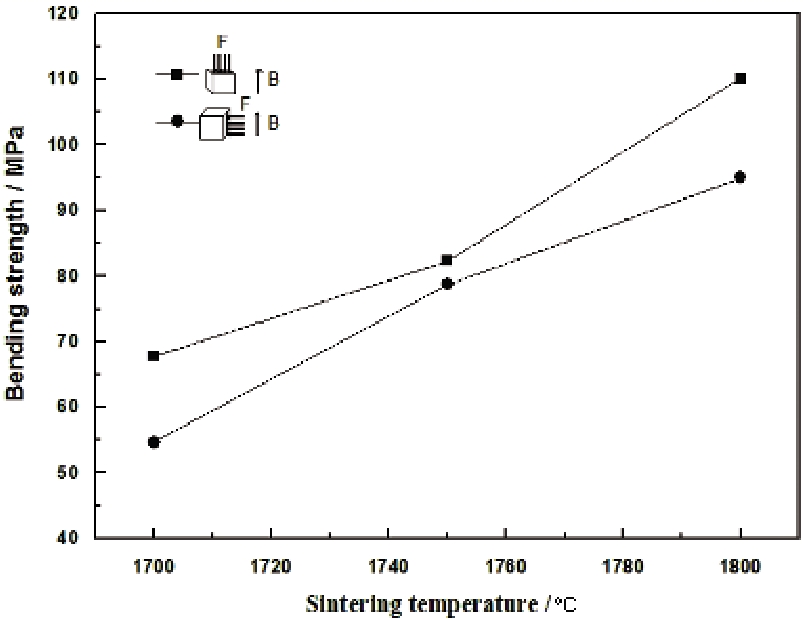 2. 烧结温度的提高有利于氮化硅陶瓷织构度的增加, 主要是通过促进晶粒生长实现。在1700℃烧结的氮化硅陶瓷的织构度为0.40, 在1800℃烧结的氮化硅陶瓷的织构度达到0.76。烧结后的织构化样品具有各向异性抗弯强度性能。
