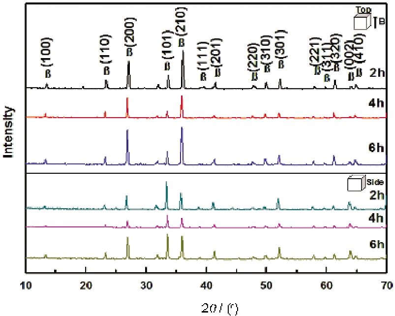 图2给出了在0T和6T磁场中成型的样品在1750℃烧结2 h后的XRD图谱。图2中没有检测到α-Si3N4相, 说明在此温度条件下α相全部转变为β相。在0T磁场下成型的样品, 其顶面和侧面内的衍射峰没有区别, 表明Si3N4晶粒没有发生取向。在6T磁场下成型后, 样品的顶面和侧面内衍射峰强度发生了明显的不同, 顶面内的(210)和(200)衍射峰是最强的, 相反侧面内的(101)衍射峰最强, 表明Si3N4晶粒明显地发生了取向, 且Si3N4晶粒的a轴或b轴是趋向于沿着磁场的方向排列。