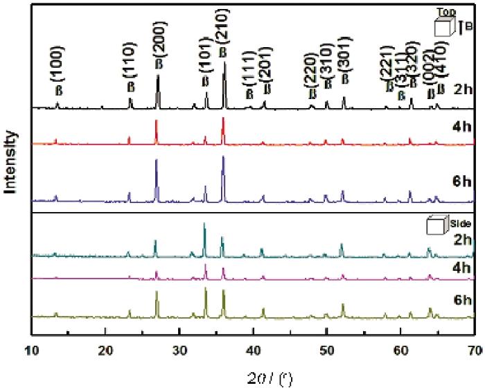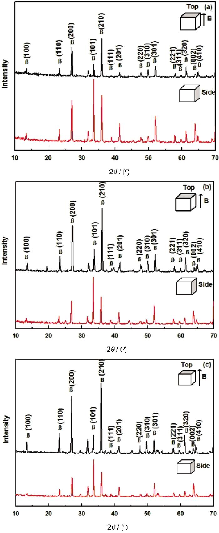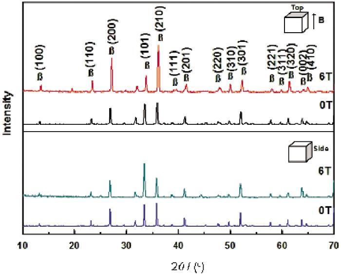 用D/MAX-2550型X射线衍射仪对样品的顶面(与磁场垂直的表面)和侧面(与磁场平行的表面)进行物相和取向分析, 采用Lotgering取向因子进行织构度评价, 公式为[16]