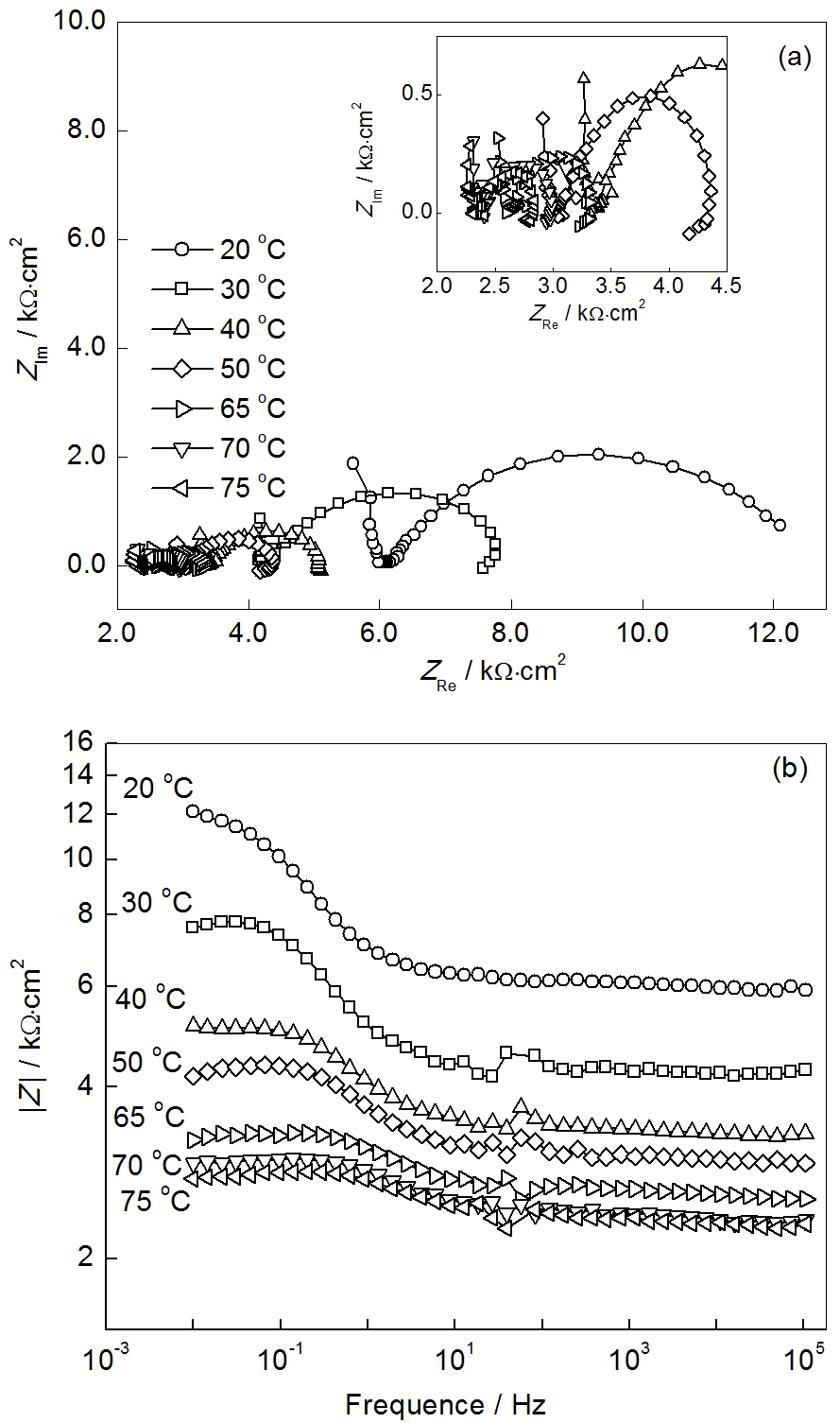 图1为X80钢在20~75 ℃温度范围内酸性红壤中的EIS谱。可见,在所测温度范围内X80钢的EIS表现为双容抗弧:低频区容抗弧均为扁平半圆,表明弥散效应较强,一般认为其与电极表面不均匀性、吸附层及介质导电性差等有关;对于高频区不完整的容抗弧,本文认为是土壤介质本身的容抗行为的反映。一般而言,EIS低频区 (Nernst阻抗) 通常由电极控制过程主导,由低频区阻抗可获得腐蚀电化学过程动力学参数,如电荷转移电阻和双电层电容等。Nyquist图低频区出现感抗特征,这可能由吸附中间产物的形成或表面反应较剧烈造成。实验温度范围内,温度的影响明显:随温度升高,低频区容抗弧半径逐渐减小,Bode图低频区阻抗值|Z|下降,说明X80钢腐蚀过程电荷转移电阻逐渐减小。温度升高,X80钢的阳极反应离子化过程变的相对容易,土壤中溶解氧扩散速率增加,这些都使EIS容抗弧半径减小。Nyquist图未出现Warburg阻抗特征,说明本实验条件下氧扩散过程不足以成为腐蚀过程的控制步骤,管线钢表面的电极过程为活化控制。