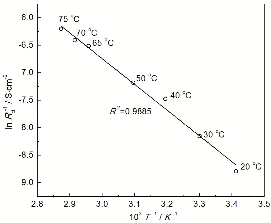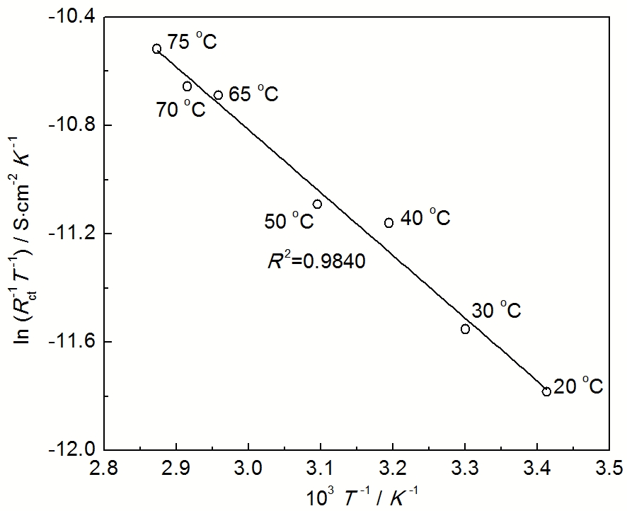 以ln(Rct-1/T) 对1000/T作图得图6所示线性关系,直线斜率