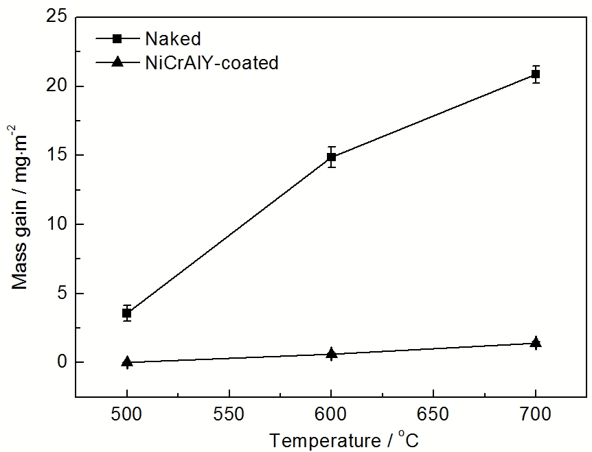 Fig.7 Mass gains of the naked and NiCrAlY- coated Sm2Co17 magnets after oxidation for 192 h in air at different temperatures