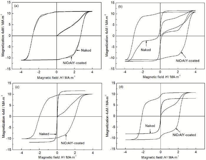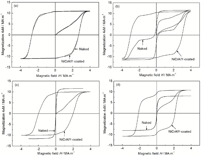 Fig.8 Hysteresis loops of naked and NiCrAlY-coated Sm2Co17 magnets at 25 ℃ (a) and after oxidation for 192 h at 500 ℃ (b), 600 ℃ (c) and 700 ℃ (d)