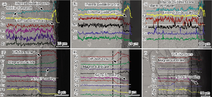 Fig.4 Cross-sectional SEM images and EDS elements line-scannings across the naked (a~c) and NiCrAlY-coated Sm2Co17 magnets (d~f) after oxidation of 192 h in air at 500 ℃ (a, d), 600 ℃ (b, e) and 700 ℃ (c, f)