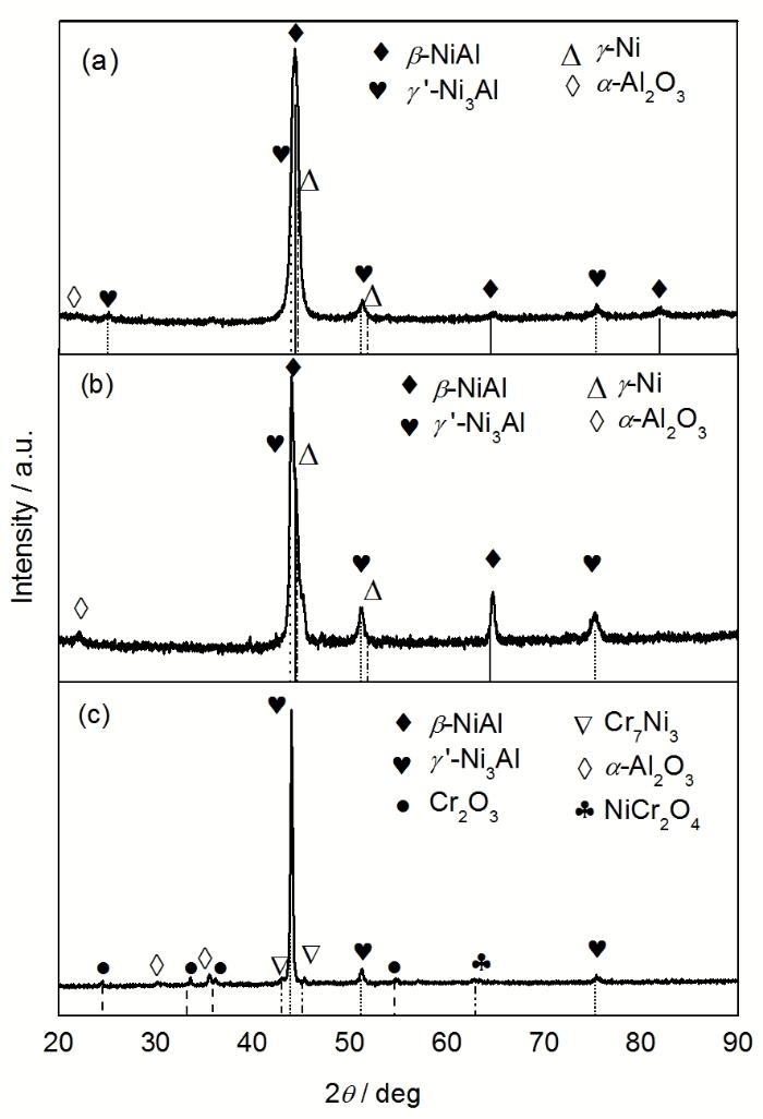 Fig.5 XRD patterns of the NiCrAlY coating after oxidation for 192 h at 500 ℃ (a), 600 ℃ (b) and 700 ℃ (c)
