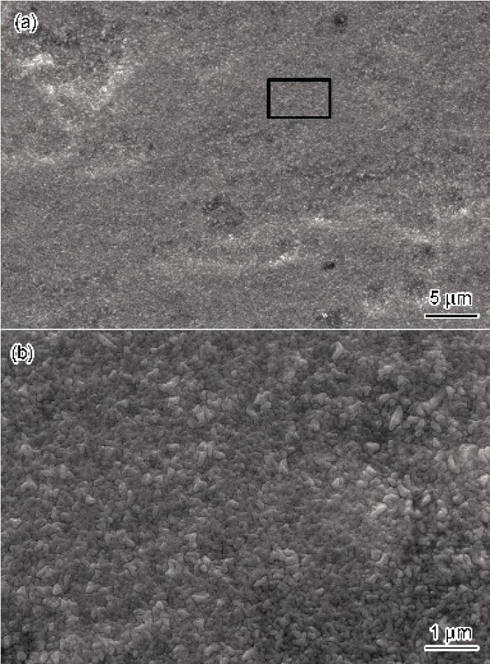Fig.1 Surface SEM morphology of the sputtered NiCrAlY coating on the Sm2Co17 magnet (a)and the magnified image of the square area in Fig.1a (b)