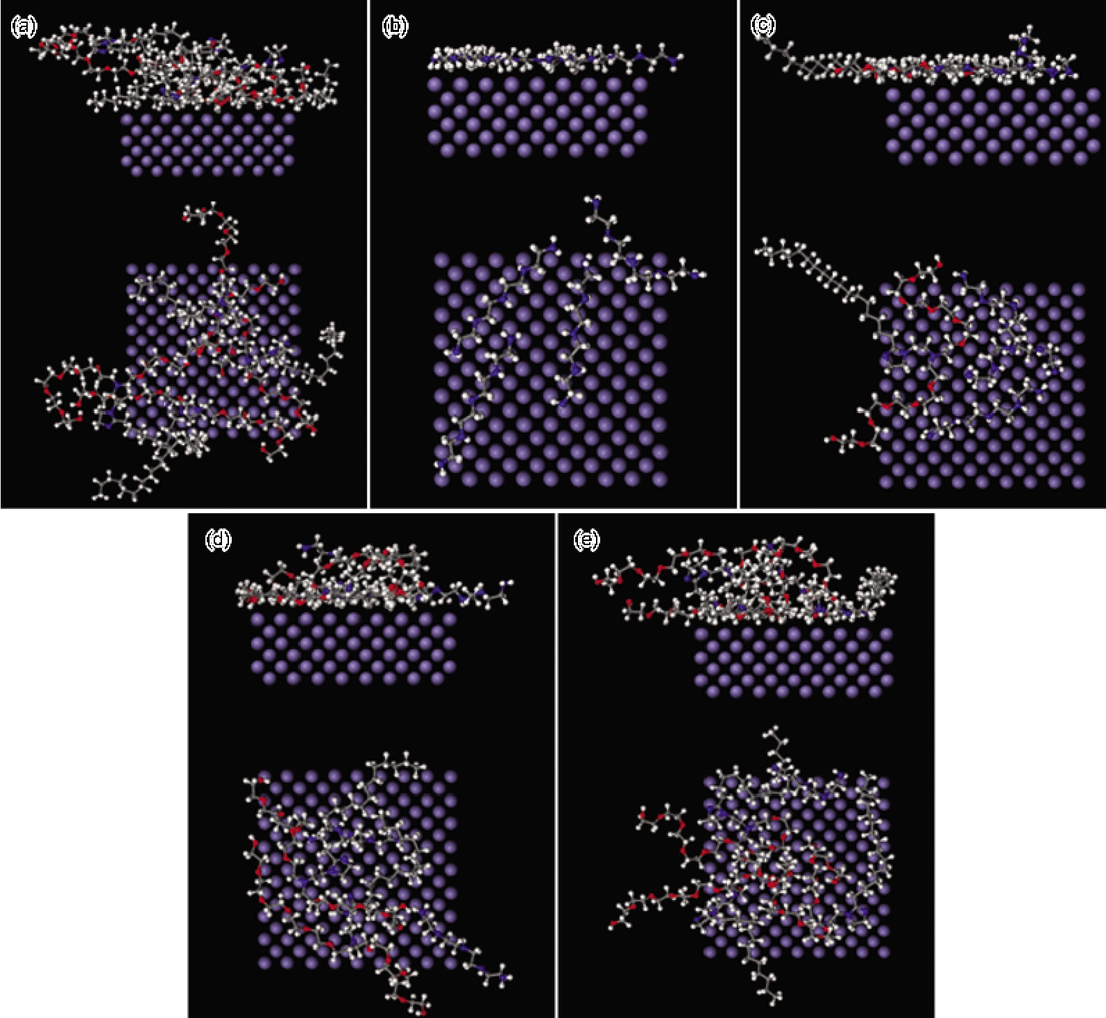 Fig.5 Equilibrium adsorption configurations on Fe(100) surface for different inhibitor molecules: (a) four HASI, (b) four TEPA, (c) one HASI and three TEPA, (d) two HASI and two TEPA, (e) three HASI and one TEPA (the top is side view and the below is top view)