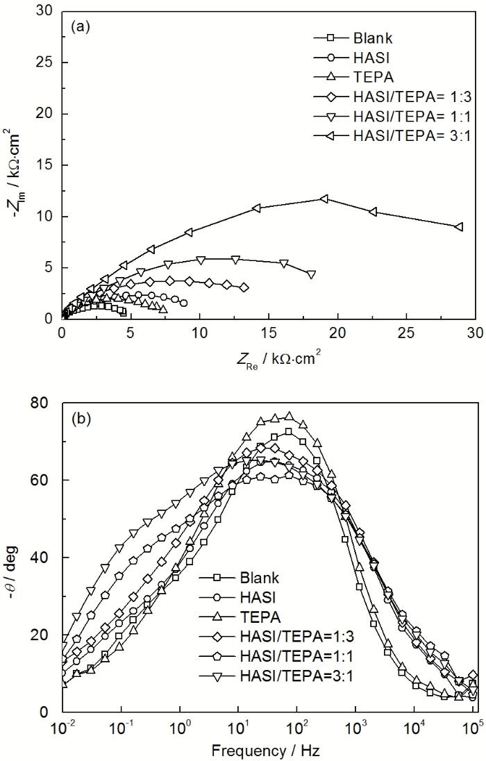 图2为在含3.5%NaCl饱和Ca(OH)2溶液中钢筋电极的电化学阻抗行为。可以看出,无论单独添加咪唑啉衍生物或TEPA,还是复配缓蚀剂后,与空白时相比,阻抗复平面 (图2a) 容抗弧半径增大,表明添加缓蚀剂后钢筋电极表面腐蚀反应电阻增加,钢筋抗Cl-侵蚀能力增强。尤其是随复配缓蚀剂中咪唑啉衍生物含量的增加,容抗弧半径逐渐增大,这表明缓蚀剂分子在钢筋电极表面的吸附不断增强,吸附所形成的保护膜可有效屏蔽介质中腐蚀性成分与钢筋表面的接触,从而阻碍了腐蚀的进行,缓蚀效率提高。由图2b可以看出,与空白试样相比,添加缓蚀剂后,最大相位角特征频率逐步向低频方向偏移,表明缓蚀剂在电极表面的覆盖度增加,所形成的缓蚀剂吸附膜均匀性和致密性增强,保护性能提高。另外还可发现,无论空白还是添加缓蚀剂时,钢筋阻抗行为明显具有两个时间常数特征,分别对应着 Nyquist复平面上两个容抗弧。高频端容抗弧为电极表面双电层电容对扰动信号的响应,表征钢筋电极/溶液界面的阻抗行为;低频端容抗弧对应着钢筋电极表面复合膜对激励信号的响应,这层膜主要由吸附缓蚀剂和腐蚀产物所构成,为一种复合性保护膜,其阻抗行为与复合膜的致密性和均匀性相关[14]-[16]。
