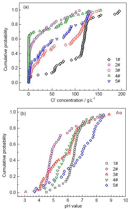 图2 新疆某气田各作业区地层水中Cl-浓度及pH值分布的累积概率