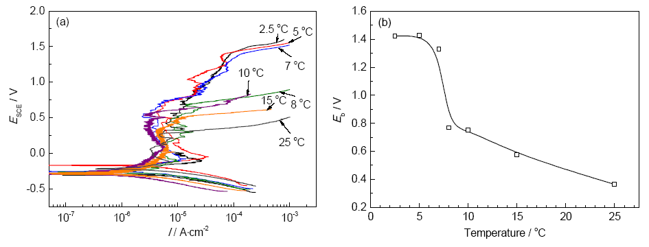 Fig.4 Potentiodynamic polarization curves of 316LSS under the condition with Cl- concentration of 1.4×105 mg/L and pH value of 4 (a) and break down potentials at different temperatures obtained from