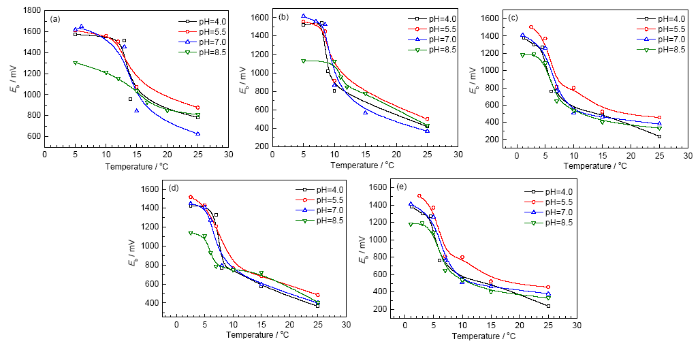Fig.5 Breakdown potential as a function of temperature under the conditions of different Cl- concentrations and pH values: (a) 3.7×103 mg/L, (b) 3.7×104 mg/L, (c) 8.5×104mg/L, (d) 1.4×105 mg/L, (e) 2.18×105 mg/L