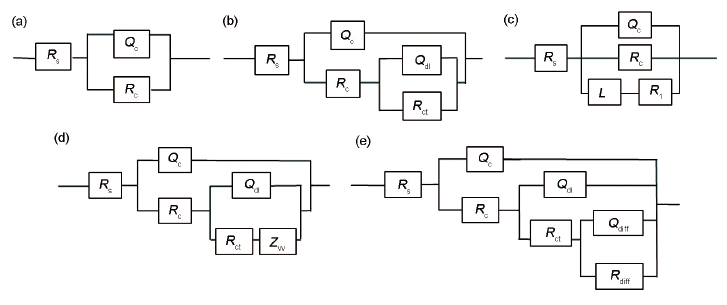 Fig.11 Equivalent circuits for solvent-free epoxy coating system: (a) model A, (b) model B, (c) model C, (d) model D, (e) model E