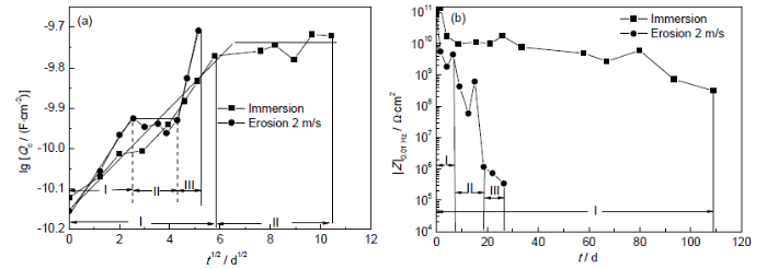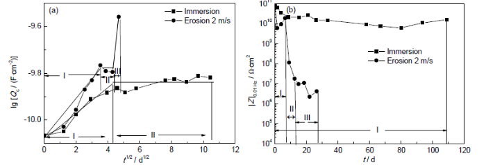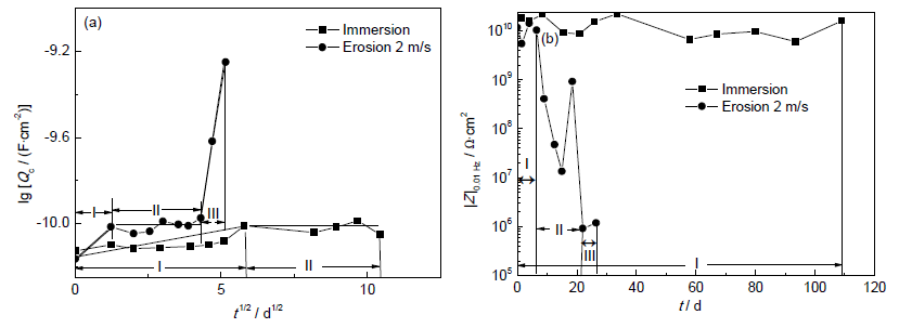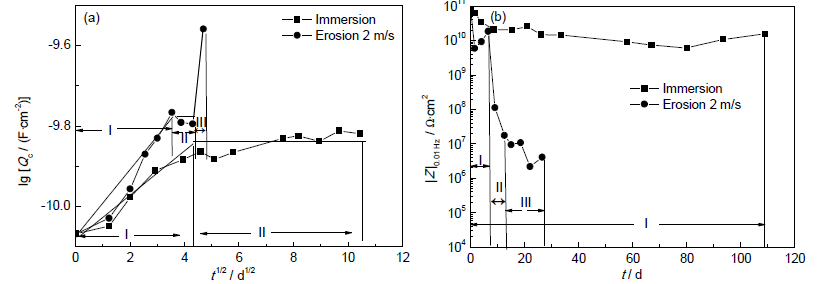 Fig.14 Evolutions of Qc (a) and |Z |0.01 Hz (b) of epoxy powder coating C during immersion under static and erosion conditions at 60 ℃