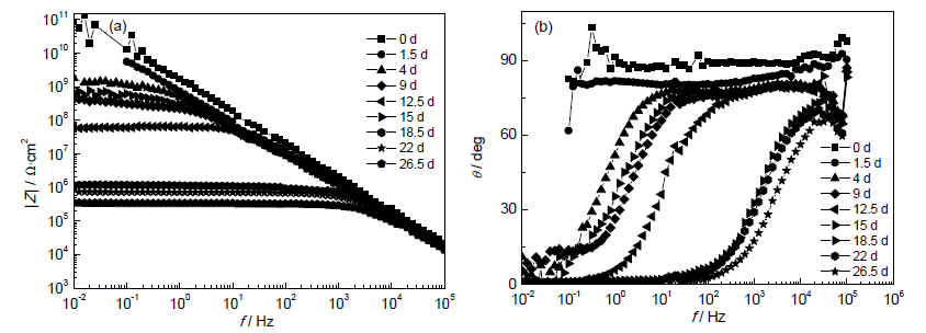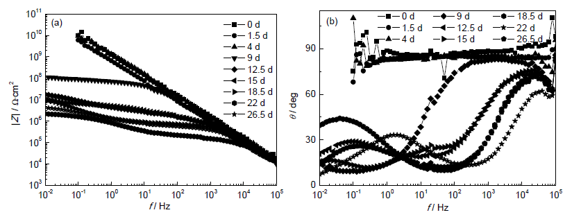图2和3分别为环氧粉末涂层A在60 ℃流动冲刷和静态条件下3.5%NaCl溶液中浸泡不同时间的Bode图。由图2a可以看出,环氧粉末涂层A初期的涂层低频阻抗模值|Z |0.01 Hz大于1×1011 Ωcm2,此时涂层在饱和吸水初期阶段,具有优异的防腐绝缘屏蔽性。在流动含砂条件下,12.5 d后的数量级为1×107 Ωcm2,15 d后升至1×108 Ωcm2以上,此时|Z |0.01 Hz变大的原因是界面处发生了腐蚀反应,腐蚀产物初始阶段反向渗透压作用一定程度上阻塞了腐蚀介质在厚膜型涂层中活性或非活性的传输通道,抑制离子向界面渗透,起到一定的延缓腐蚀作用。浸泡22 d时,下降到1×107 Ωcm2以下,此时观察涂层表面,并未发现起泡,但此时涂层基本失去保护作用[10]。从图3a可以看出,环氧粉末涂层A在静态相同腐蚀介质浸泡条件下低频阻抗模值|Z |0.01 Hz随浸泡时间虽然也呈下降趋势,但是变化特别缓慢,在109 d时仍保持在1×108 Ωcm2以上,涂层在饱和吸水后仍具有很好的屏蔽和保护作用。