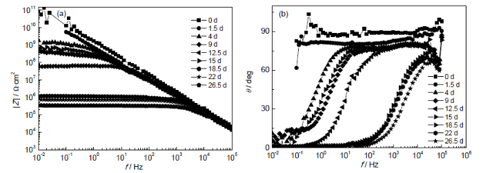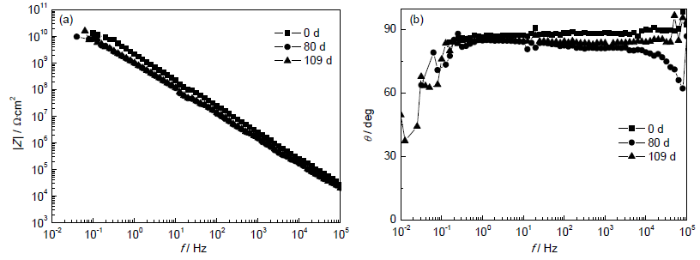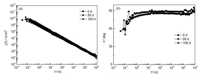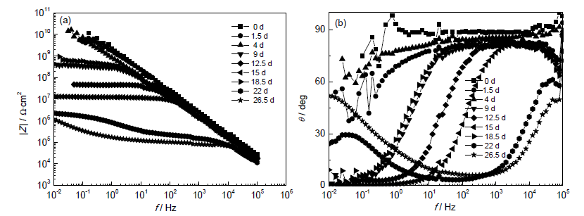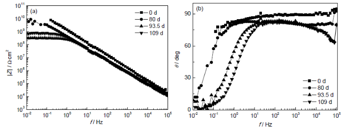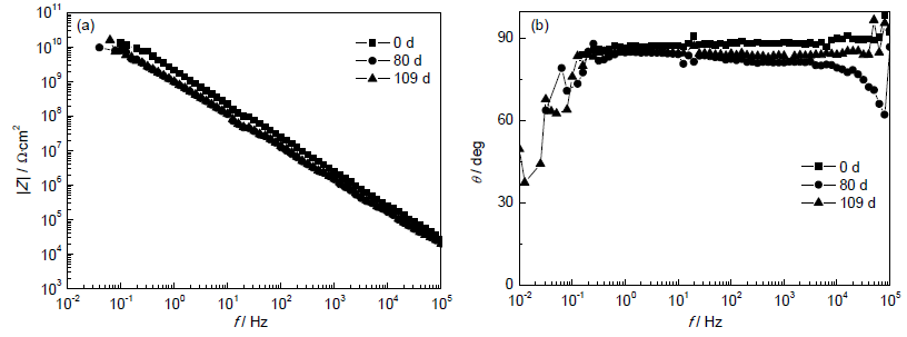 图4和5分别为环氧粉末涂层B在流动冲刷和静态浸泡条件下浸泡不同时间的Bode图。由图4a可以看出,初始时涂层低频阻抗值|Z |0.01 Hz大于1×1011 Ωcm2,此时涂层性能良好。在流动含砂条件下,浸泡15 d时降至1×107 Ωcm2以下,可观察到涂层表面出现微小的起泡,涂层基本失效;此后下降较慢,浸泡22 d时为2.2×106 Ωcm2,26.5 d时升至4.1×106 Ωcm2,此时|Z |0.01 Hz同样出现增大的异常现象,原因与环氧粉末涂层A相同。环氧粉末涂层B在静态相同腐蚀介质浸泡条件下低频阻抗模值|Z |0.01 Hz基本没发生变化 (图5a),109 d时仍接近1×1010 Ωcm2,相位角接近90°,说明涂层仍具有很好的屏蔽作用。