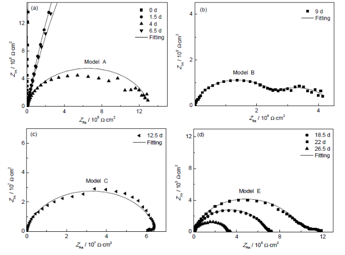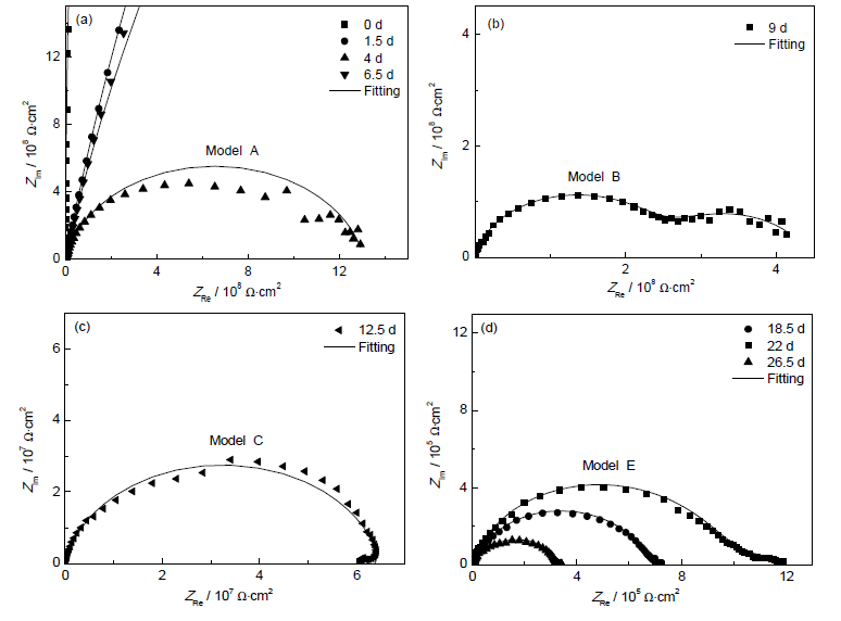 Fig.8 Nyquist plots of epoxy powder coating A immersed in 3.5% NaCl solution at 60 ℃ for 0~6.5 d (a), 9 d (b), 12.5 d (c) and 18.5~26.5 d (d) under erosion condition