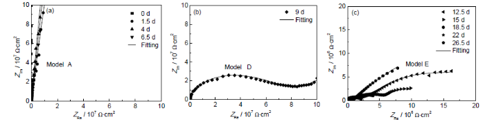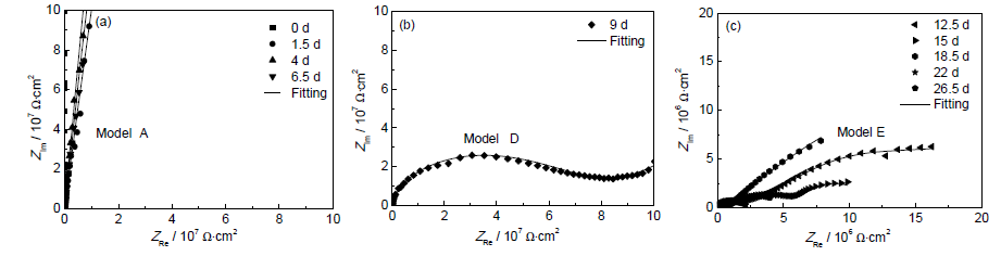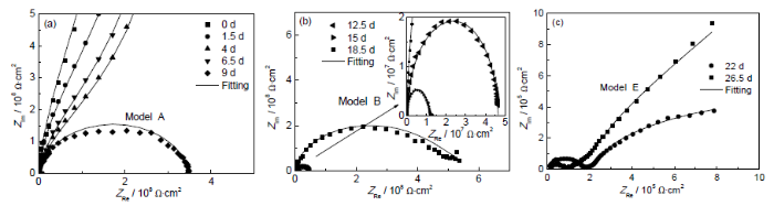 Fig.9 Nyquist plots of epoxy powder coating B immersed in 3.5%NaCl solution at 60 ℃ for 0~6.5 d (a), 9 d (b) and 12.5~26.5 d (c) under erosion condition