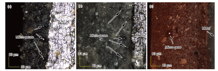 对3种无溶剂环氧涂层进行了CLSM断面形貌观察。由图15中可以看到,环氧粉末涂层A、B和无溶剂环氧液体涂层C均存在断面孔隙,孔隙直径约为20~30 μm,从孔隙存在的位置来看,环氧粉末涂层A和B体系孔隙主要集中于涂层/金属界面处,而无溶剂环氧液体涂层C体系孔隙主要存在于涂层本体且接近涂层表面。从孔隙的数量来看,环氧粉末涂层B体系孔隙数量最多,环氧粉末涂层A体系次之,无溶剂环氧液体涂层C体系最少。3种涂层体系孔隙的数量以及存在位置的不同主要是由涂层的成膜和固化方式不同导致的:由于环氧粉末涂层A和B体系均采用高温固化成膜方式,在高温静电喷涂过程中残留在涂层内部的空气和低熔点物质没有足够的时间迁移到表面进行消泡,而接近金属处温度最高,涂料凝胶化时间最短,因此孔隙数量较多且位置多位于涂层/金属界面处。而无溶剂环氧液体涂层C为常温慢速固化成膜,相比于环氧粉末涂层A和B体系固化时间长得多,初期空气和助剂小分子等有足够时间迁移出表面或者聚集在表面附近,在固化后期由于涂层已经接近表干,残留气体或少量低沸点物质只能聚集在表面附近,因而孔隙数量较少且存在于涂层表面附近区域。环氧粉末涂层A和B体系虽然同为环氧粉末且采用高温固化方式,但是环氧粉末涂层A固化速度慢于环氧粉末涂层B,涂层具有较好流平和长距离高分子迁移的过程,喷涂过程中残留在涂层内部的气体或小分子结构有相对较多的时间迁移出表面,因此环氧粉末涂层A孔隙率少于环氧粉末涂层B的。这些孔隙的存在,首先,减少了涂层的有效厚度,其次,在涂层/界面处有接近裸露的金属存在,当腐蚀性介质扩散到界面的时候,这些裸露的地方会优先发生腐蚀。而无溶剂环氧液体涂层C虽然在涂层/金属界面处并没有发现孔隙的存在,但是在涂层本体内存在孔隙,只是减少了涂层的有效厚度;在冲刷条件下,由于介质的连续冲刷,介质对涂层不断冲击,造成涂层的物理切屑磨损,扩大涂层中的微孔隙同时连通新的小孔,使得存在于涂层中比较邻近的孔隙或低交联密度区连通形成导通路径,导致腐蚀介质沿导通路径很快到达涂层/金属界面,使界面腐蚀发生速率快于静态浸泡条件下的。