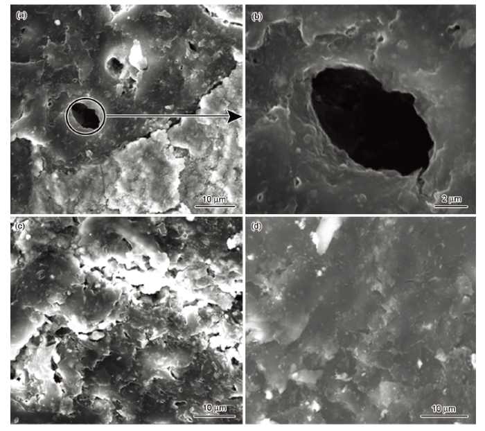 Fig.16 SEM surface morphologies of epoxy powder coating B (a, b), epoxy powder coating A (c) and solvent-free epoxy liquid coating C (d) after erosion test for 26.5 d