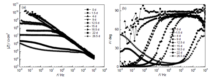 Fig.2 Modulus (a) and phase angle (b) diagrams of epoxy powder coating A after immersion in 3.5%NaCl solution at 60 ℃ for different time under erosion condition