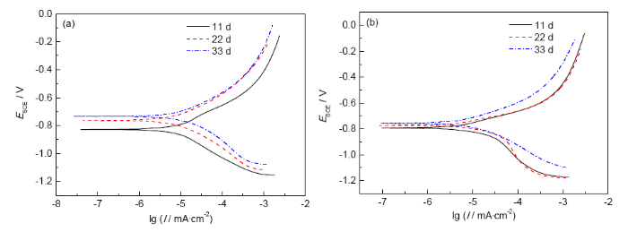 Fig.5 Polarization curves of Q235 (a) and DC06 (b) steels after salt spray test in different periods