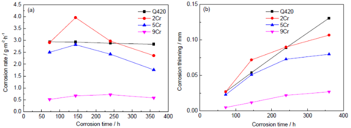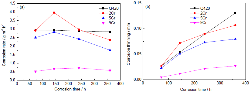 (1) Q420钢在模拟的高盐度大气环境中的腐蚀速率基本保持不变,含Cr钢腐蚀速率先增大后减小,且在实验周期内耐蚀性能优于Q420钢。