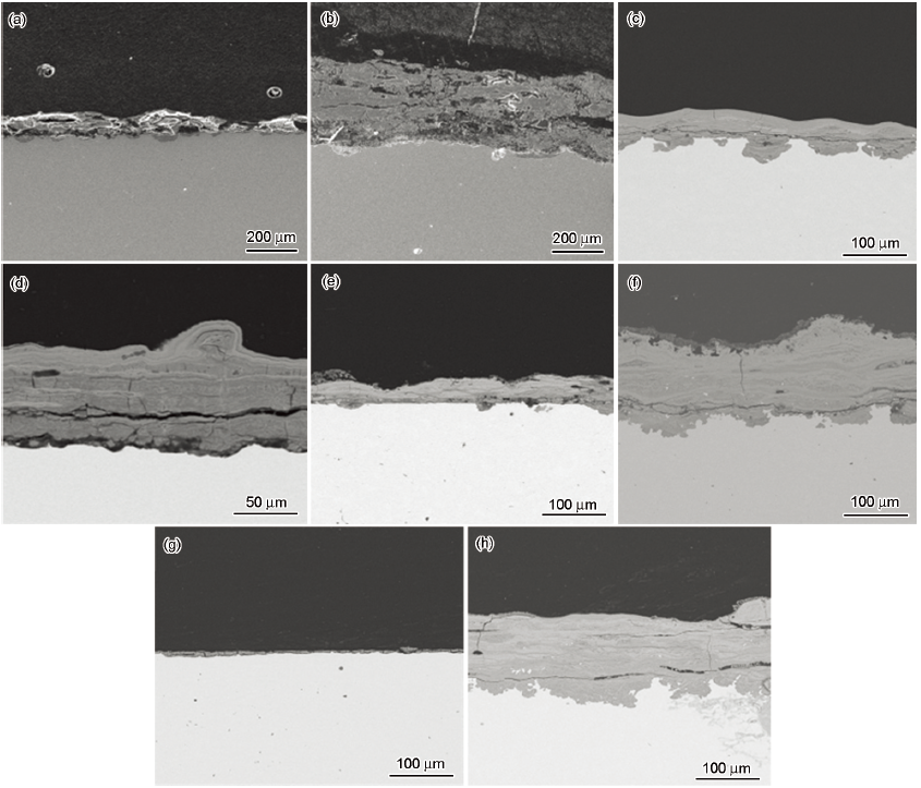 Fig.3 Cross sections of rust layers formed on Q420 (a, b), 2Cr (c, d), 5Cr (e, f) and 9Cr (g, h) steels after corrosion for 72 h (a, c, e, g) and 360 h (b, d, f, h)