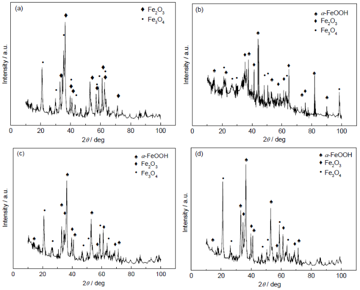 Fig.4 XRD patterns of Q420 (a), 2Cr (b), 5Cr (c) and 9Cr (d) steels after corrosion for 360 h and removing of the outer rust layer