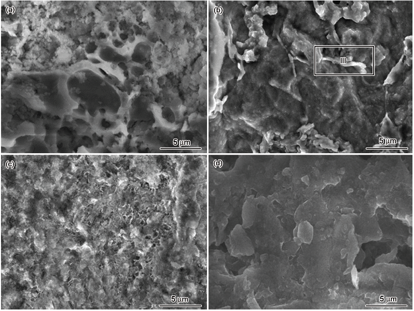 Fig.7 SEM images of 20# carbon steel after corrosion in 300 mg/L ABS (a, c) and 300 mg/L AS (b, d) at 154 ℃ (a, b) and 282 ℃ (c, d)