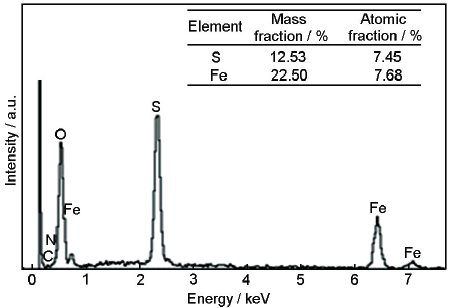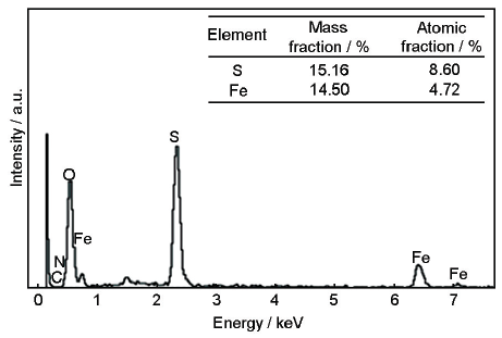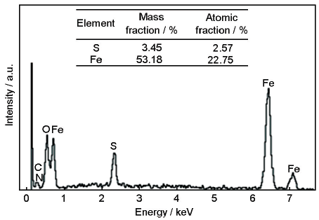 图8和9为20#钢试样在154和208 ℃下300 mg/L ABS中腐蚀产物膜 (图3b和c) 的EDS分析结果。可以看出,腐蚀后的碳钢表面主要由5种元素组成,分别是C、N、O、S和Fe,其中Fe和C两种元素主要来自于碳钢,N、S和O主要来自于该硫酸盐溶液,部分O来自于气相中的O2。