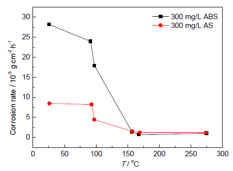 图6所示为相同浓度的ABS与AS中20#碳钢的腐蚀速率对比。可以看出,当腐蚀温度低于200 ℃时,ABS对碳钢的腐蚀速率比AS的快,温度越低时二者的腐蚀速率差别越大;当温度达200或282 ℃时,两者几乎没有明显差别。