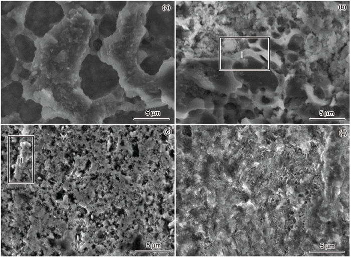 Fig.3 SEM images of 20# carbon steel after corrosion in 300 mg/L ABS at 108 ℃ (a), 154 ℃ (b), 208 ℃ (c) and 282 ℃ (d)