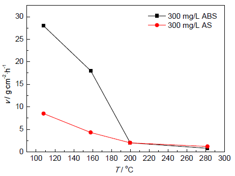 Fig.6 Corrosion rates of 20# stainless steel in 300 mg/L ABS and AS at different temperatures
