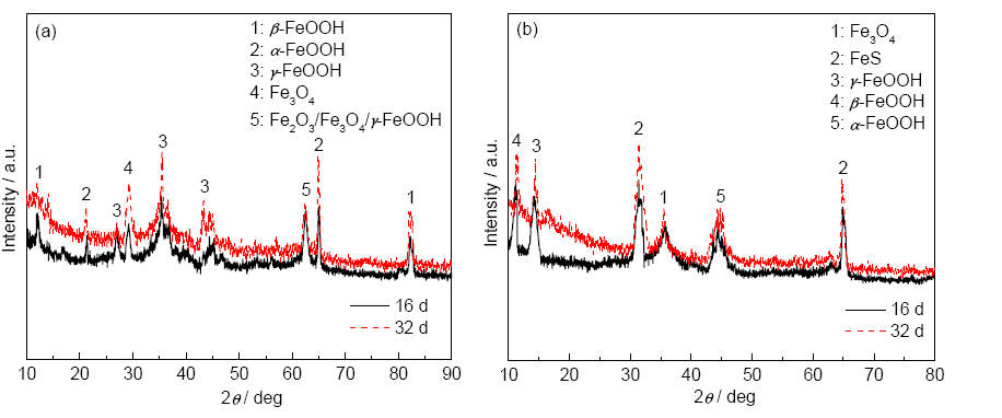 Fig.6 XRD spectra of corrosion products of A710 steel after immersion in 3.5%NaCl (a) and 400 mg/L Na2S+3.5%NaCl (b) solutions for 16 and 32 d