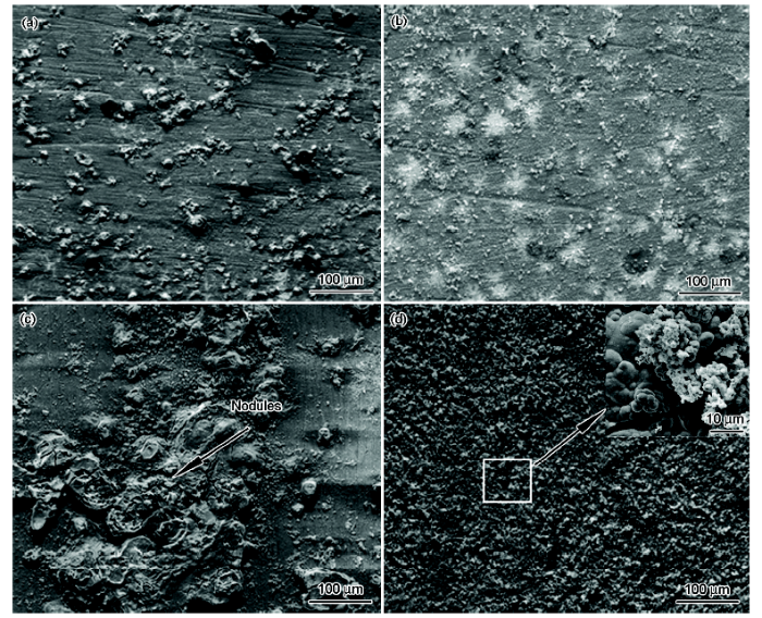 Fig.2 Surface micro-morphologies of A710 steel after immersing in 3.5%NaCl solution for 1 d (a), 4 d (b), 16 d (c) and 32 d (d)