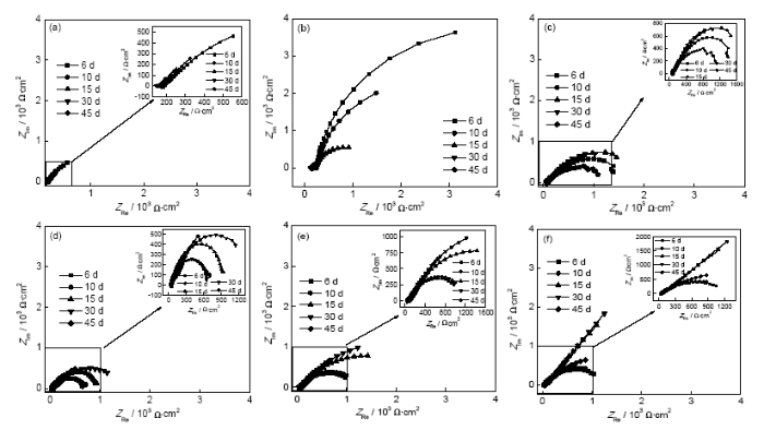Fig.8 Nyquist plots of EIS diagrams of 1# (a), 6# (b), 7# (c), 8# (d), 10# (e) and 12# (f) electrodes after exposure for different time in the juncture area of seawater-sea mud