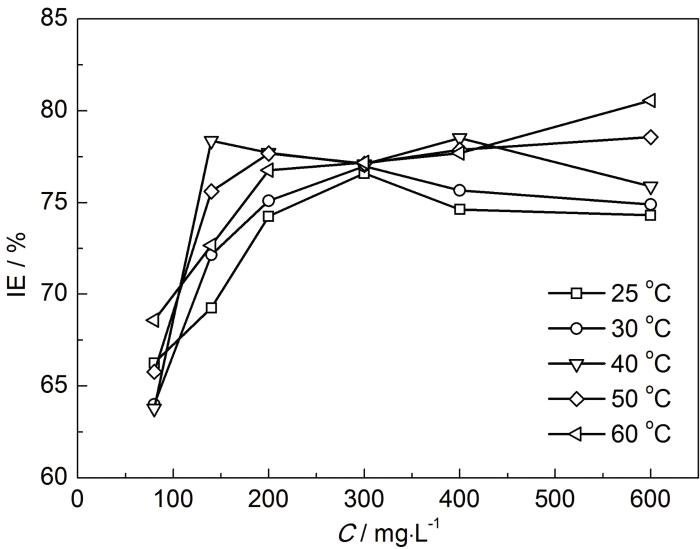 失重实验时间为7 d,所用20#碳钢规格为50 mm×25 mm×2 mm。实验前将试片用丙酮除油,乙醇脱水,放入干燥器内24 h后称重。测试不同温度 (25,30,40,50和60 ℃),不同缓蚀剂浓度 (0,80,140,200,300,400和600 mg/L) 条件下20#碳钢的腐蚀速率及缓蚀率。