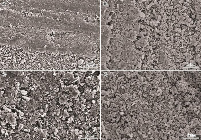 SEM images of 20# carbon steel after immersion in 3.5%NaCl solutions containing 300 mg/L sixteen alkyl imidazoline for 7 d at 30 ℃ (a), 40 ℃ (b), 50 ℃ (c) and 60 ℃ (d)