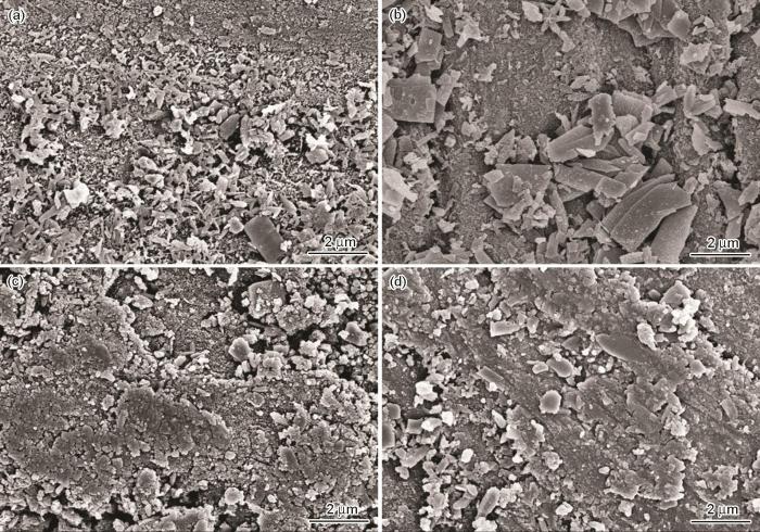 不同实验温度下腐蚀试片的表面腐蚀形貌SEM像见图10,11,12。由图10可以看出,十六烷基咪唑啉浓度为140 mg/L时,30 ℃时20#碳钢表面的腐蚀产物疏松多孔;温度为40和50 ℃时的腐蚀产物为密集的颗粒状,缓蚀剂能很好地阻碍腐蚀介质对金属的腐蚀;但是在60 ℃时,腐蚀产物的形貌发生变化,由颗粒状变成细棒状,体积变小,且覆盖较为松散,部分20#碳钢基体出现裂痕,说明此时缓蚀剂不能很好地覆盖在20#钢表面,缓蚀率较低。由图11中可以看出,十六烷基咪唑啉浓度为300 mg/L时,在不同温度下腐蚀产物多且致密,缓蚀剂在20#碳钢上的覆盖程度大致相同,所以缓蚀率随温度变化相对平缓,下降得很少。由图12d可看出,当十六烷基咪唑啉浓度达到600 mg/L时,一方面,由于温度在60 ℃时,腐蚀产物膜从疏松多孔变为具有保护性,使得20#碳钢本身的腐蚀速率变小;另一方面,缓蚀剂虽然有脱附,但由于缓蚀剂浓度高,可以很快地补充吸附在20#碳钢上,使得缓蚀率变高。