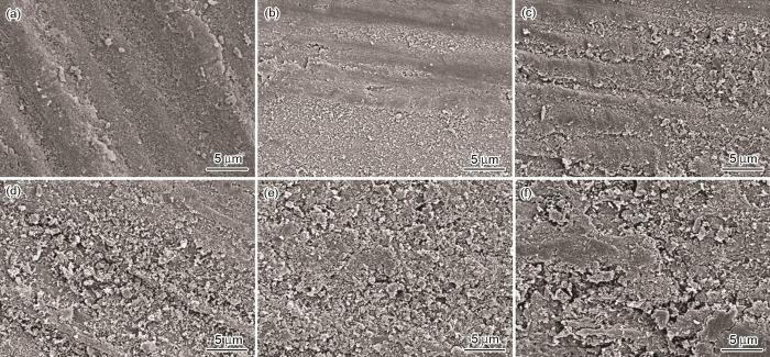 SEM images of 20 # carbon steel after immersed in 3.5%NaCl solution containing different concentrations of sixteen alkyl imidazoline at different temperatures for 7 d: (a) 30 ℃, 140 mg/L; (b) 30 ℃, 300 mg/L; (c) 30 ℃, 600 mg/L; (d) 50 ℃, 140 mg/L; (e) 50 ℃, 300 mg/L; (f) 50 ℃, 600 mg/L