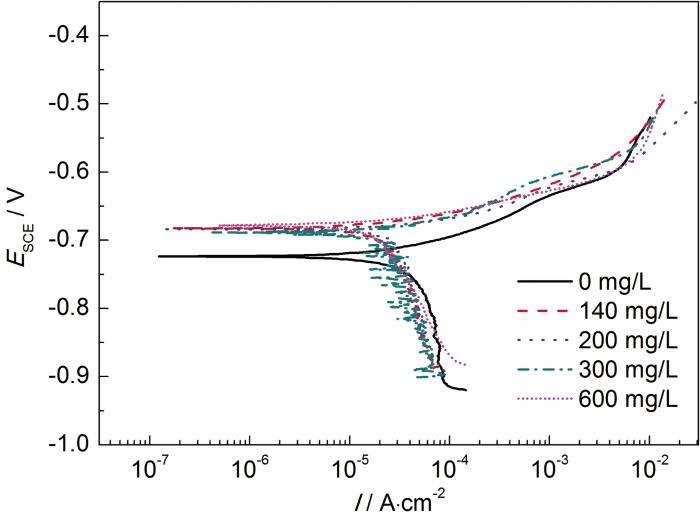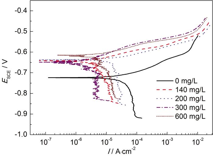 Polarization curves of 20# carbon steel in 3.5%NaCl solution containing imidazoline phenylpropionate at 25 ℃