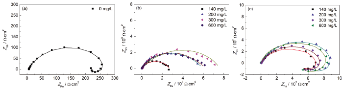 Nyquist plots of 20# carbon steel during immersion at 25 ℃ in 3.5%NaCl solutions without inhibitor (a) and with different concentrations of sixteen alkyl imidazoline (b) and imidazoline phenylpropionate (c)