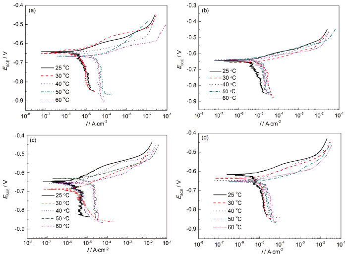 Polarization curves of 20# carbon steel in 3.5%NaCl solutions with 140 mg/L (a), 200 mg/L (b), 300 mg/L (c) and 600 mg/L (d) sixteen alkyl imidazoline at different temperatures